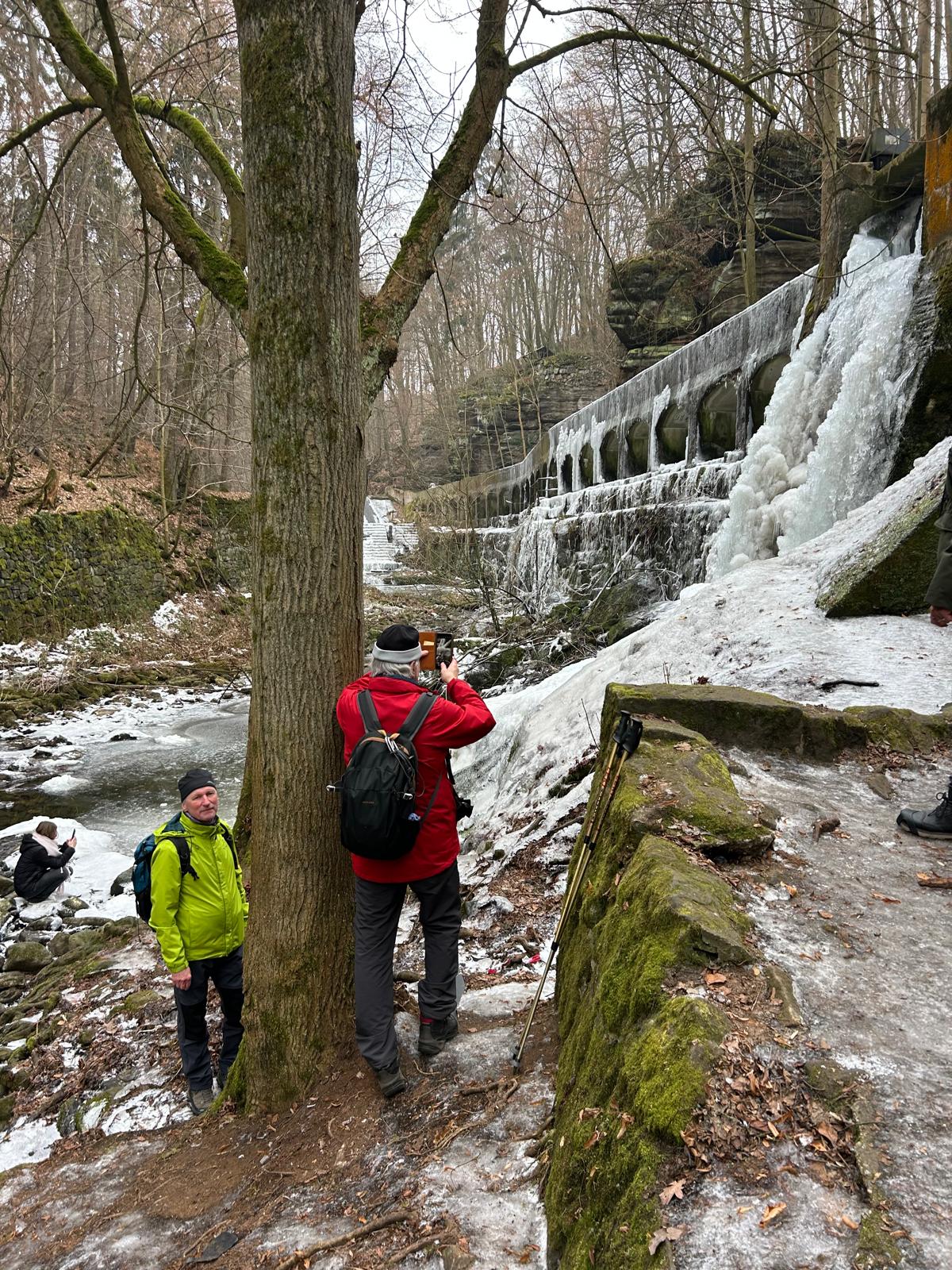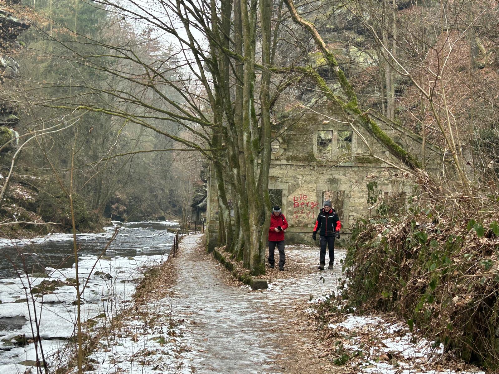 Auch im Januar trafen sich wieder die ganz emsigen Bergpiraten zu einer Wanderung durch die Wesenitzklamm. Nachdem unser Egon am Pirnaer Bahnhof abgeholt wurde und auch Gert Richtung zu Hause in den Transportbus in den Liebethaler Grund zusteigen konnte, startete die Tour am Klettergarten. Gleich zu Beginn zeigte sich, dass die Wanderung eine Herausforderung werden sollte. Der vereiste Wanderweg forderte gleich die höchste Aufmerksamkeit der Teilnehmer. Vorsorglich legte Egon gleich seine “Schuhrödel” an, um einen besseren Halt zu bekommen. So war es nur eine Frage der Zeit bis der erste Sturz von den anderen Teilnehmer zu verzeichnen war. Der gestürzte Bergpiratenvorstand (nicht durch die Bergpiratenmitglieder) war die Folge des glatten Wanderweges. Natürlich durfte er sich erst wieder aufrichtetn nachdem ausreichend Beweisfotos geschossen wurden.
