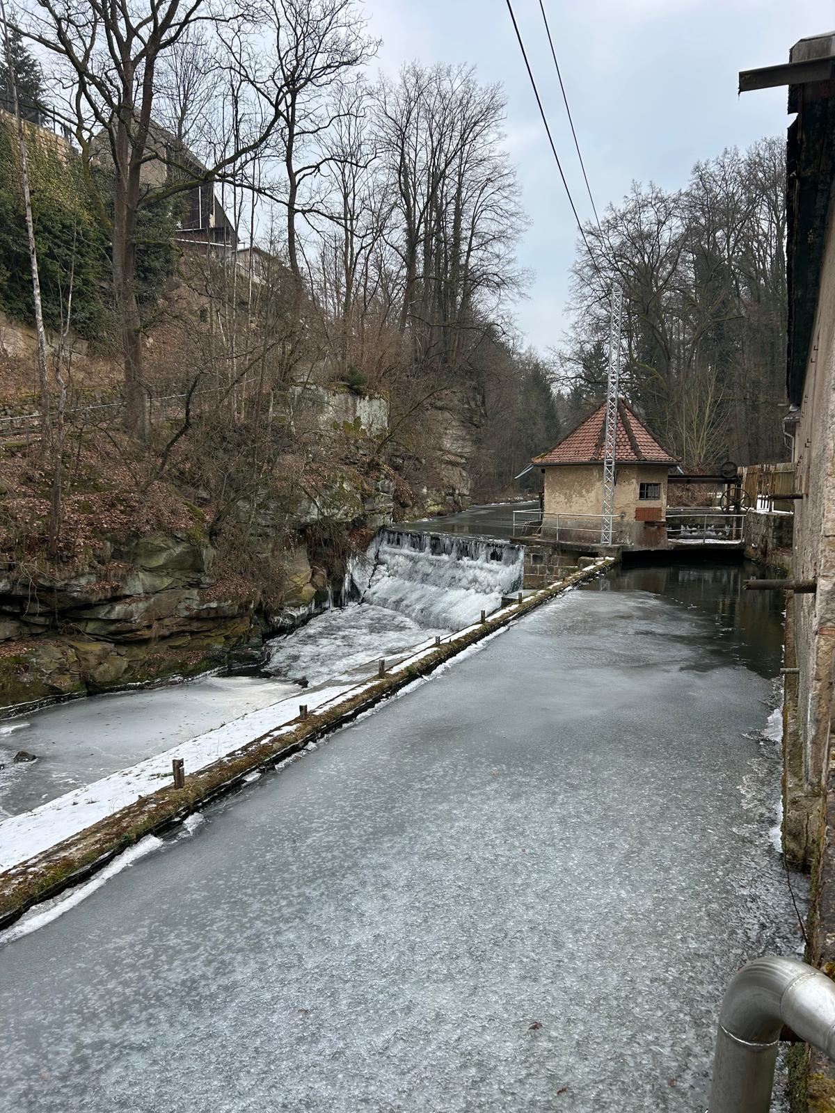 Eine kleine Pause gönnten sich die Teilnehmer an der Wesenitz, bevor es weiter zu dem imposanten Nietzelwehr in der hinteren Klamm der Wesenitz ging. Das Wasserkraftwerk war zudem im Betrieb und zeugte davon, was unsere Vorfahren bereits an ingenieurtechnischen Leistungen vollbracht hatten.